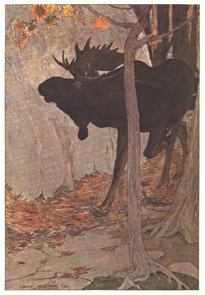 Receiving no answer to his defiance, the great bull turned his attention again to the ooze around the spring. After sniffing it all over he fell to furrowing it excitedly with the two lowermost branches of his antlers,––short, broad, palmated projections thrust out low over his forehead, and called by woodsmen “the ploughs.” Every few seconds he would toss his head fiercely, like an ordinary bull, and throw the ooze over his shoulders. Then he pawed the cool, strong-smelling stuff to what he seemed to consider a fitting consistency, sniffed it over again, and raised his head to “bell” a fresh challenge across the spacious solitudes. Receiving no answer, he snorted in disgust, flung himself down on the trampled ooze, and began to wallow with a sort of slow and intense vehemence, grunting massively from time to time with volcanic emotion.