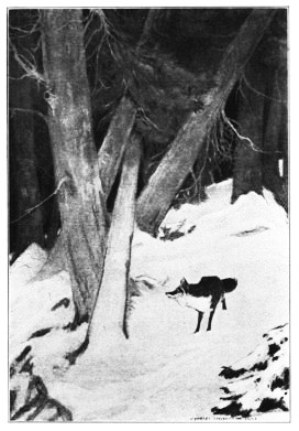 This would have been the end of the young bull’s battlings and wooings; but as his good luck would have it, it was at the very edge of the shelf that he collapsed. Disengaging his victorious antlers, the conqueror thrust viciously and evisceratingly at the victim’s exposed flank. The latter was just struggling to rise, with precarious foothold on the loose-turfed brink of the steep. As he writhed away wildly from the goring points, the bushes and turf crumbled away, and he fell backwards, rolling and crashing till he brought up, battered but whole, in a sturdy thicket of young firs. Regaining his feet he slunk off hurriedly into the dark of the 262 woods. And the victor, standing on the brink in the white glare of the moonlight, “belled” his triumph hoarsely across the solemn spaces of the night.