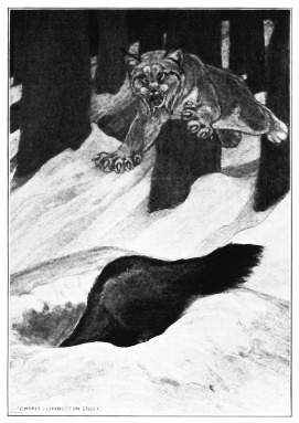 At this instant there came a crackling and swishing in the thicket; and the Kid, as if released from a spell, turned with a scream and started to flee. He tripped on a root, however, and fell headlong on his face, his yellow curls mixing with the brown twigs and fir needles. Almost in the selfsame second a big gray lynx burst from the green of the underbrush and sprang upon the little, sprawling, helpless form.