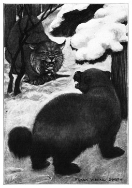 At first he could see nothing. But to his sensitive little nerves came a feeling that something was there. Gradually his eyes, accustoming themselves to the gloom, began to disentangle substance and shadow. Then suddenly he detected the form of a gray crouching animal. He saw its tufted ears, its big round face, with mouth half open grinningly. Its great, round, pale, yellow green eyes were staring straight at him.