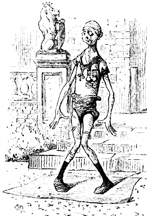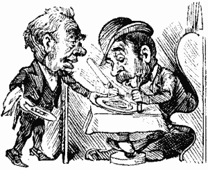 Then, on the other hand, there's old Tom, or rayther yung Tom, for he's one of them jolly chaps as never seems to get no older. Why he goes about a grinning away, and a chatting away, and a chaffing of old Bill, who's much younger than him, like anythink. So I naterally arsked him how he acounted for his good sperrits. And what was his arnser? Why, hurly training. His Father was a Comic Play Actor, and allers ready for a larf, and offen took yung Tom with him to the Theater till he becum quite a favrite with all the merry gals there, who used to pet him, and give him sweets, and teach him to say all sorts of funny things; and, when he was old enuff, he was promoted to the dignity of a full-blown Super, at 18 shillings a week, and all his close found. His grate differculty was in looking serious and keeping serious when serious bizziness was a going on; and on one occashun, when he was playing one of a band of sangwinerry ruffians, sumthink so took his fansy, that he not only bust into a loud larf hisself, but set all the rest of the sangwinerry ruffians a larfing too, and quite spiled all the effect of the scene. So he was bundled off neck and crop, and soon afterwards got a sitewashun as a Pleaceman, but, for the life of him, he never could keep hisself serious when he was before a Magistrate with a case; for if ennybody made a joke, or ennybody larfed, Tom set off a grinning with the best of 'em, and once axshally made a joke with his Worship; so of course off he was sent again, to find a rest for the soles of his feet, and a free play for his good sperrits, in the honnerabel capacity of a Waiter.