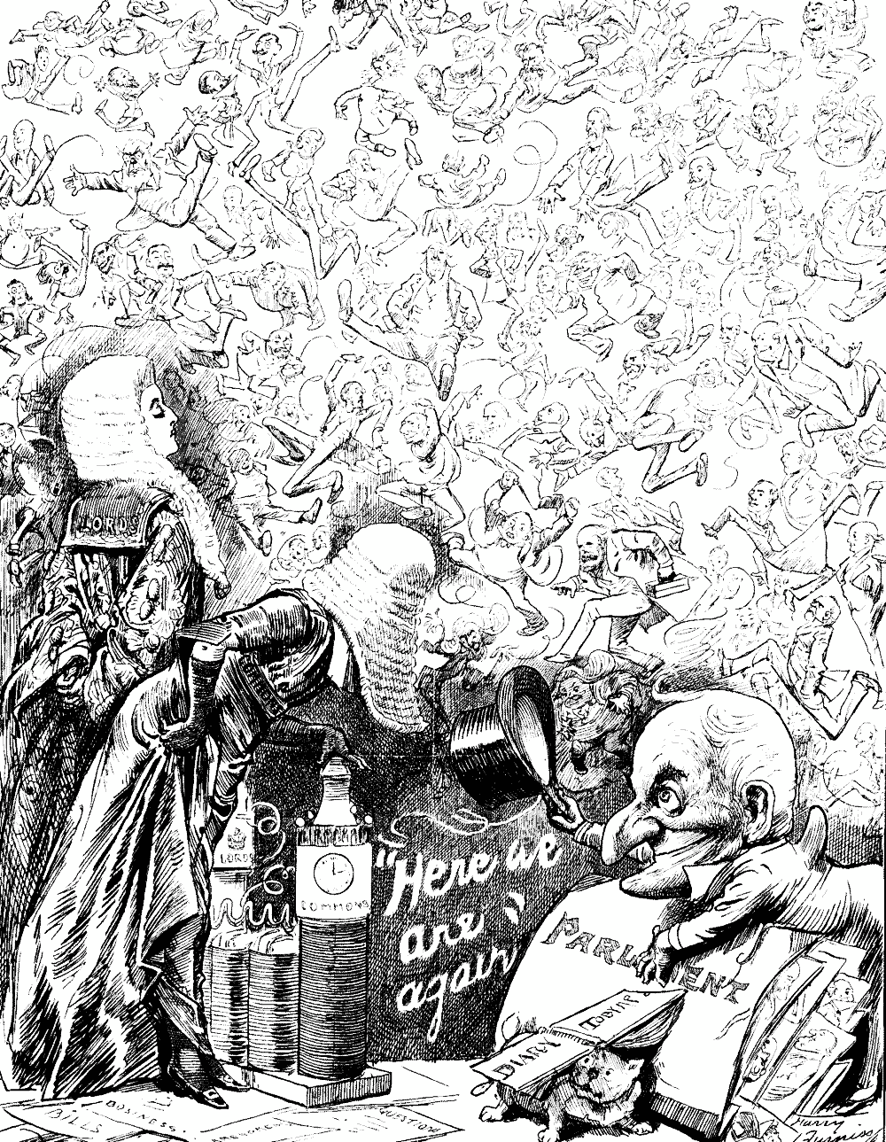 "Haven't seen you since we met at Greenlands' icy mountains in the Recess," Old Morality said, continuing our conversation interrupted by the cheers that greeted our arrival. "You remember how bitterly cold the day was? Rather thought you hurried away. Wish you could have stayed to luncheon. We happened to have something succulent. However, you must come and dine in my room behind the Speaker's Chair; Akers-Douglas will show you the way. We do it pretty snug there, I can tell you. What sort of a Session shall we have? Who can tell? Usual sort of thing, I suppose. We shall bring in a lot of Bills; Gentlemen opposite will talk some of them out; at Easter and Whitsuntide Recesses we shall squeeze a stage of some through, under pressure of the holidays; then three weeks in June and most of July will be wasted; and in August we'll suspend Standing Orders, and ram through everything we can. As for me, I shall endeavour to do my duty to the Queen, to the Country, and to the Members of this House, in whichever part they sit. Did you ever, dear Toby, consider how a kettle boils? The water nearest to the fire is first heated, and (being heated) rises to the top. Its place is supplied by colder portions, which are heated in turn, and this interchange takes place till all the water is boiling hot. That is how we shall get through the Session. The Report of the Parnell Commission, being most heated, will rise to the top first. Then the Tithes Bill, Land Purchase, the Education question, and one or two other little matters will follow, till we're all in boiling water. Good-bye now; don't forget to come across Akers-Douglas about Eight o'Clock."