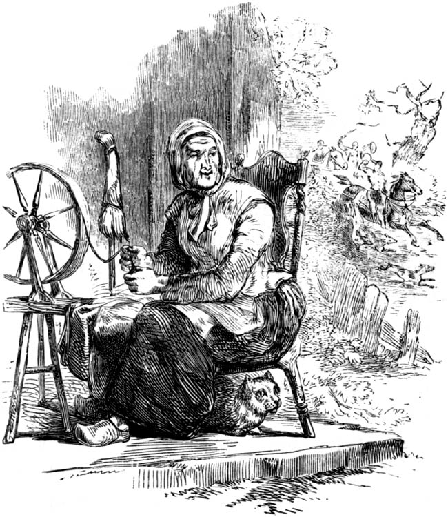 The old woman shut the cottage door, heaped some dry fir-logs on the fire, and sate down to her spinning-wheel. The rain pelted against the shutters, the wind howled in the tree-tops, and roared loudly in the forest behind the hut; it was a terrible night out of doors, but within the cottage it was snug enough,—the fire was blazing merrily, the old woman's wheel turned [68]briskly round, the kettle was singing a low quiet song to itself beside the crackling logs, and the cat was sitting on the hearth, looking warm and comfortable. But I am afraid she was not at all comfortable—in her mind; for discontented people seldom are. It never entered her head to consider whether there were any poor cats abroad that night, without a shelter over them; for grumblers are always selfish, and never think of the wants of others. In fact, she could think of nothing, just at that time, but the luxuries enjoyed by the fortunate cats who might happen to be born in grand palaces; so, curled up in the warmest corner of the hearth, she sate watching the little spouts of flame that kept flashing up from the pine logs, and wishing, for the hundredth time that day, that she had had the good luck to be a palace cat. Presently a very strange thing happened to her.