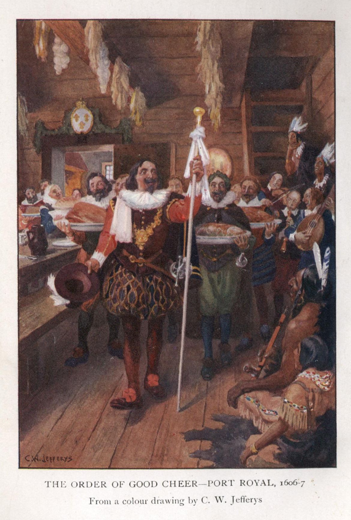 THE ORDER OF GOOD CHEER—PORT ROYAL, 1606-7 From a colour drawing by C. W. Jefferys. |