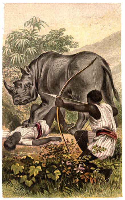 "At this work I had assisted several successive nights, till we were almost wearied with watching. At length one of the most enterprising of our young men proposed that we should no longer content ourselves with driving back the enemy, but boldly attack him, and punish him for his temerity. With this purpose we concealed ourselves in a convenient spot, till we had seen one of the river-horses issue from the water, and advance a considerable way into our plantations; then we rushed from our hiding-place with furious shouts and cries, and endeavoured to intercept his return; but the beast, confiding in his superior strength, advanced slowly on, snarling horribly, and gnashing his dreadful tusks; and in this manner he opened his way through the thickest of our battalions. In vain we poured upon him on every side our darts and arrows, and every missive weapon; so well defended was he in an impenetrable hide, that every weapon either rebounded as from a wall, or glanced aside without in the least annoying. At length one of the boldest of our youth advanced unguardedly upon him, and endeavoured to wound him from a shorter distance; but the furious beast rushed upon him with an unexpected degree of swiftness, ripped up his body with a single stroke of his enormous tusk, and then, seizing him in his furious jaws, lifted up his mangled body as if in triumph, and crushed him into a bleeding and promiscuous mass.