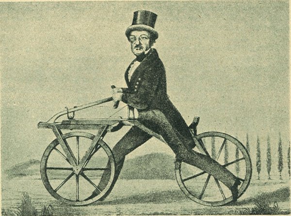 Hogy két egymás mögött elhelyezett keréken is lehet utazni, arra Draisz jött rá először abból a megfigyelésből, hogy az erős lendítéssel elgurított kerék nem dűl el addig, ameddig mozog. Az első kerékpár ennek alapján készült: két fakereket olyanformán kötöttek össze, mint ahogyan a mai kerékpárnál is látjuk. Az első kereket kormányozták. Draisz ezt az egyszerű szerkezetet úgy hajtotta, hogy a lábaival felváltva a földre ért és így lendített egyet-egyet a kerékpáron. Ezen a kezdetleges módon négyszer olyan gyorsan tudott haladni, mint a gyalogos ember.