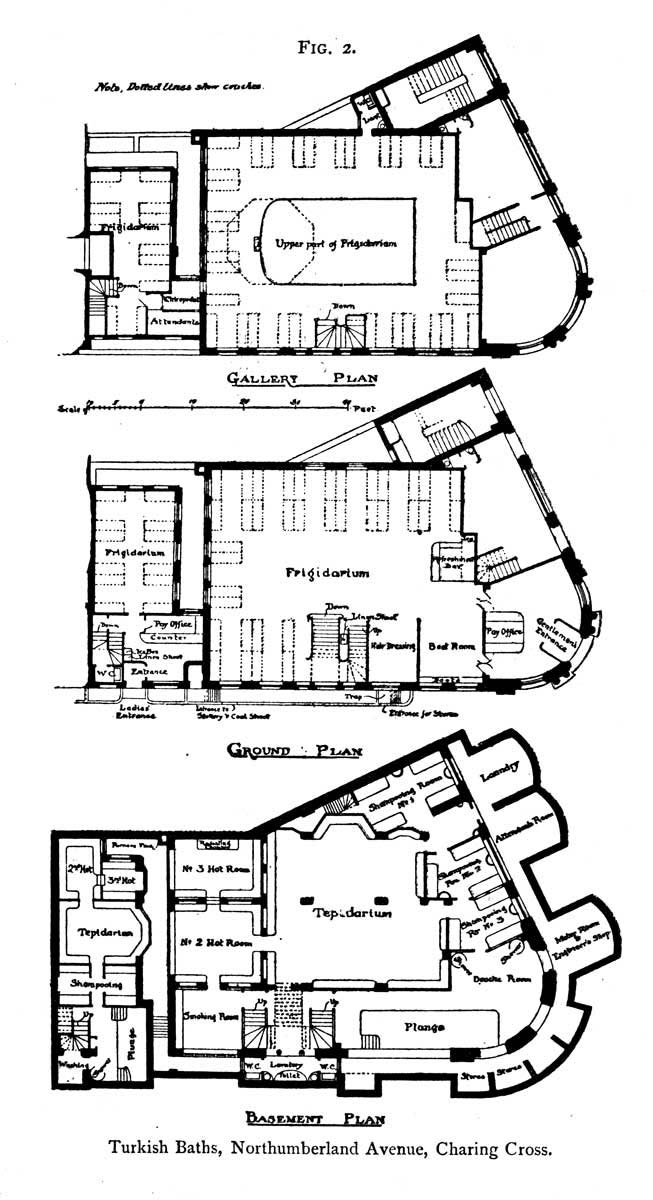 The Hammam was the first public Turkish bath erected in this country, and the Savoy (Fig. 1) is one of the latest and largest, and also on one level. It was designed by Mr. C. J. Phipps, F.S.A., to suit the basement of an existing building. Entering from Savoy Hill, a short passage conducts to a staircase leading to the vestibule, where are provided rails for hats and coats. The counter of the ticket-office is placed at the entrance to the frigidarium, and near this office is the committee room—the bath being the property of a private company. In vaults projecting under the street, provision is made for an engine and dynamo. The frigidarium serves also as the apodyterium, and is cut up into divans by ornamental wood partitions. Connected with it is a saloon for the hairdresser and chiropodist, and an attendants' room. A lavatory is provided in a recess. Access is gained to the hot rooms through double doors. The plunge bath is placed partly in the hot rooms and partly in the frigidarium. The tepidarium is divided by arcades into miniature nave and aisles. Two subdivisions at the end of the tepidarium lead to the calidarium, adjoining which is the heating apparatus, fitted with two of Messrs. Constantine's "Convoluted" stoves. Access to the stokery is gained by a passage at the end of the tepidarium.[Pg 21] The shampooing room is placed off the cooler end of the tepidarium, dwarf walls separating it from the latter apartment, as also from the lavatorium. Here, there are six marble basins, corresponding with the six marble slabs in the shampooing room. A small chamber is screened off the lavatorium to accommodate the douche and spray. A passage leads from the douche room to the attendants' room, by way of the laundry. Off this passage, and approached by doors from two of the divans, are the w.c.'s, &c., for the bathers' use. Provision for the supply of refreshments is made at the back of the office. This bath is designed in an Eastern style.[Pg 22]