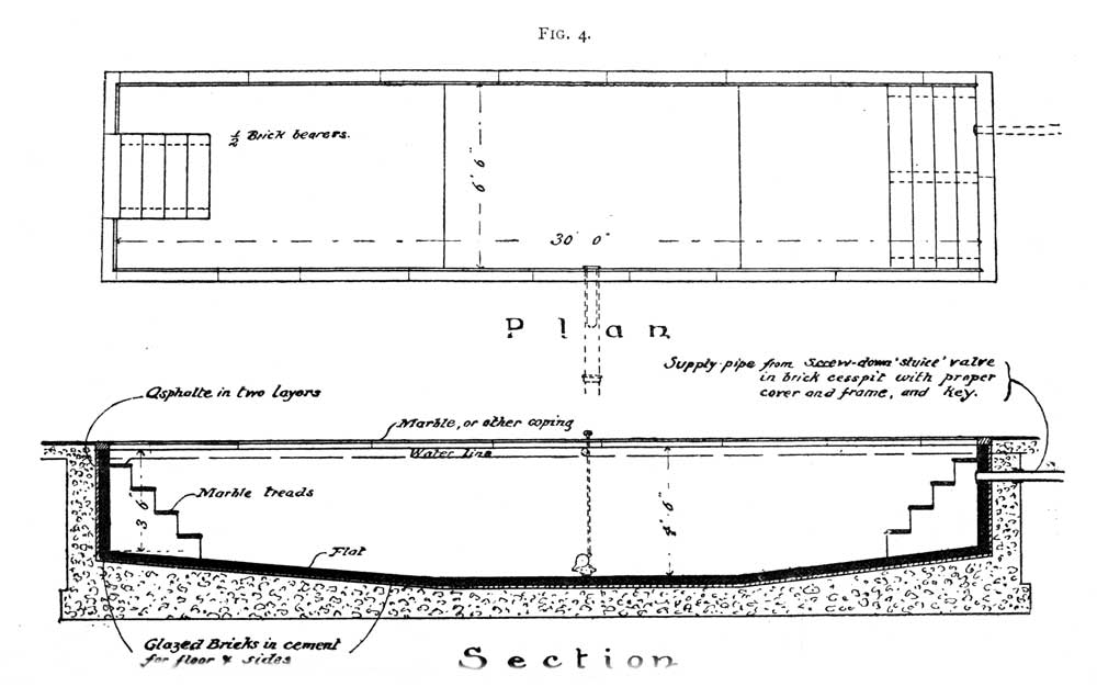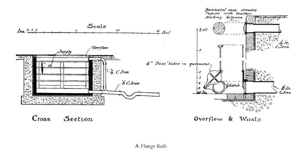 A complete private bath must contain the piscina, or plunge. Unless space and expense be no object, this cannot well be made capable of affording a vigorous dive; but endeavours should be made to secure a bath of such dimensions as will admit of a refreshing immersion of the whole body. It will be constructed and fitted exactly as a small public plunge bath.
