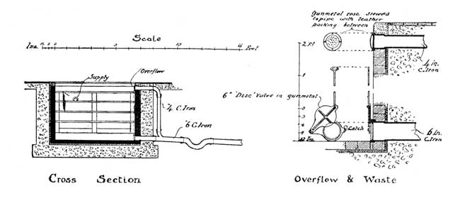 The cold supply cistern may, by the exigencies of the case, be kept down as low as the ceiling of the bath-rooms, and be placed over some subsidiary apartment. This does not give much pressure of water. For all purposes it is best to have the cistern at a minimum height of about 20 ft. above the draw-off taps and valves of the various bathing appliances. This will ensure a good head of water, and make the douche a formidable affair.