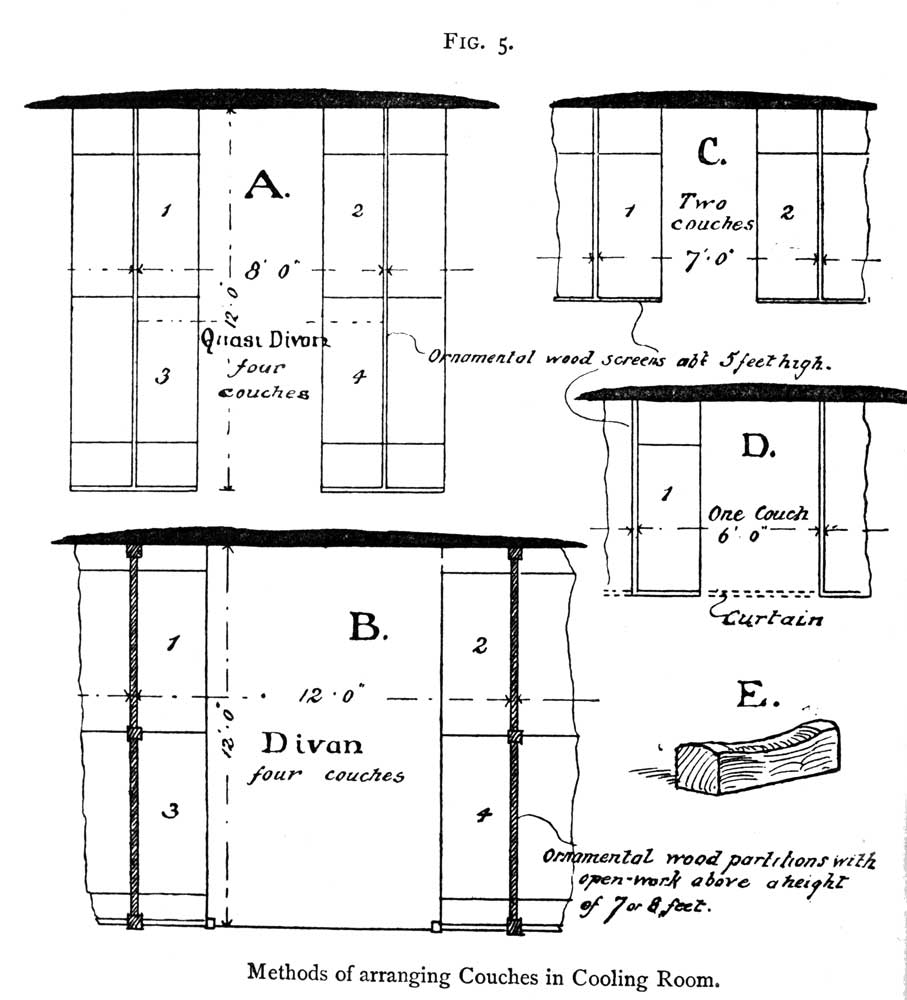 The cooling room couches are usually made 6 ft. by 2 ft.; but 6 ft. 6 in. by 2 ft. 6 in. is a more liberal allowance. They should be made of polished wood, strongly framed, stuffed with horsehair and covered with a red Turkey twill, as at A, Fig. 21. Where divans are adopted, on the Eastern model, the benches must be framed of wood, permanently fixed, and covered with mattresses kept in their places by a wooden fillet, as Fig. 20. Above the couch thus formed it is well to stretch a dado of Indian matting, affixed above to a moulded rail.