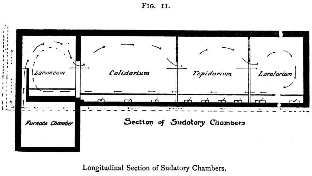 The bath in the house may consist of one of the following arrangements:—(1) A single room used as a sudatory chamber and for washing; (2) a hot room and a washing room; (3) a combined hot room and washing room, and a cooling room; (4) a cooling room, washing room, and hot room; or (5) a suite of chambers of such extent as to provide every possible luxury, such as even the old Roman gentlemen would have coveted. Where there is no second room the bather must use his bed room as a cooling and reposing room, as he must also in the cases where only a washing room and a hot room are provided.