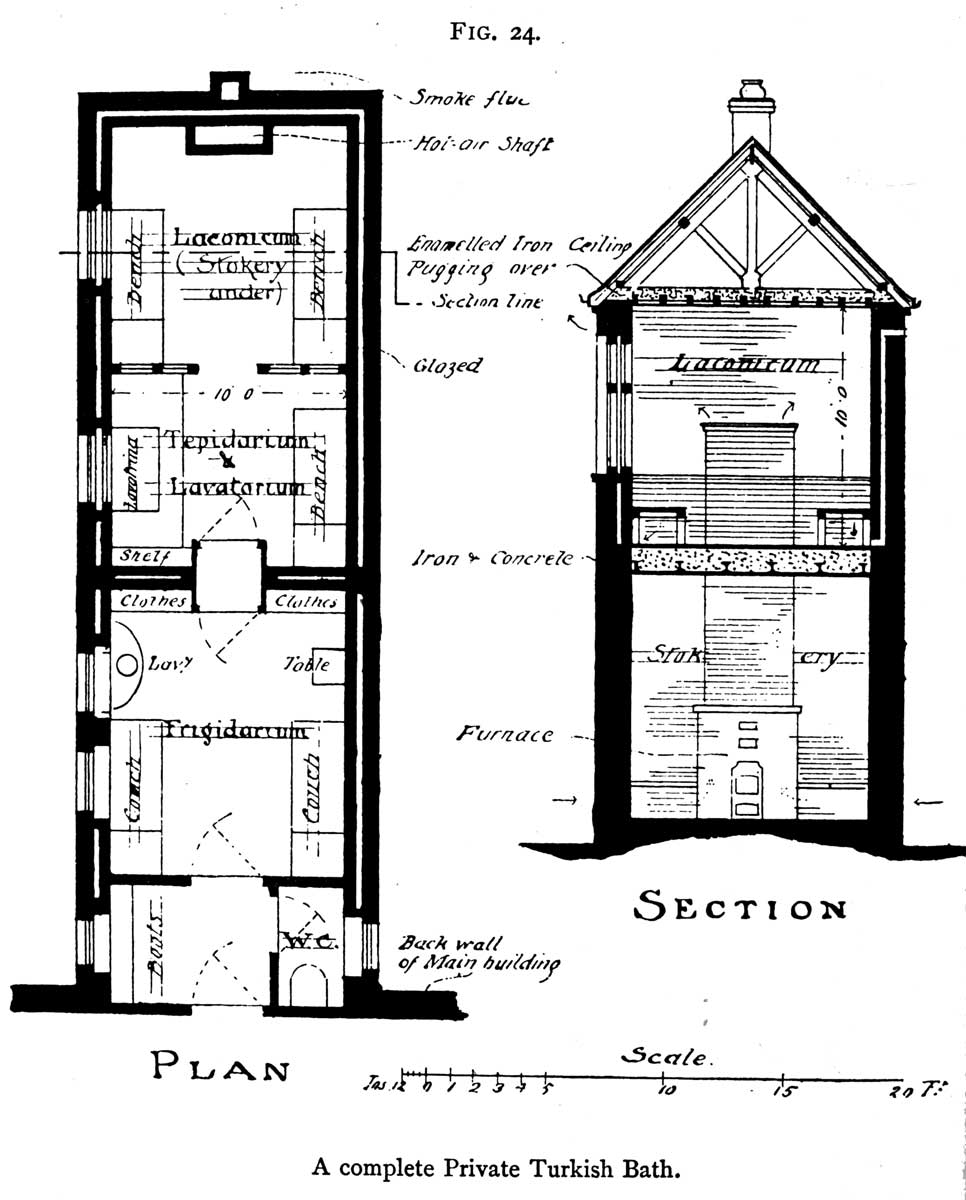 Cost of construction being now so constant a factor in every consideration, I have been led to give the above plans and descriptions of cheaply-formed baths as suggestions for the adaptation of other rooms. But plans of more elaborate baths are occasionally required, and at Fig. 24 I give the plan and cross section of a bath constructed as an appendage to, and at one and the same time as, the house. In this plan all necessaries are liberally provided for, but there is no extravagant outlay on elaboration of features and decoration. It is arranged on the first floor of a projecting wing off the main building. The frigidarium is cut off from the corridor or landing of the house by a lobby, which provides a w.c. and a space for boots and shoes and linen and towels. Between the frigidarium and bath[Pg 126] rooms is a double-doored lobby of a kind that is very useful in both public and private baths. Hung with heavy curtains over the inner face of either door, it forms a perfect preventive against the entry of the air[Pg 127] of the hot rooms into the cooling room. Between the combined tepidarium and lavatorium and the laconicum is a glazed partition with a doorway, fitted with a curtain if necessary. The walls are 18 in.—9 in. and 4½ in., with 4½ in. cavity, used for ventilation. The bath rooms are lined with glazed brickwork. The floor is of fireproof, iron and concrete, construction. Enamelled iron sheets are screwed to the ceiling joists in the hot rooms, and pugging placed over. Under the laconicum is the stokery and furnace chamber, fitted with a small convoluted stove, a hot-air shaft leading to the bath room. Fresh air comes to the stove by horizontal flues from either side of the building. The windows in the bath rooms are double. In the laconicum are two felt-covered wooden benches, as at Fig. 21 (E), ante, and a similar bench occupies one side of lavatorium, opposite which is the lavatrina, 18 in. deep, partly sunk into the floor and partly raised. The shower should be placed over this. In the frigidarium are two couches, hooks for clothes, lavatory, and toilet tables, &c. This would be a very effective plan for a comfortable private bath.