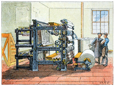 Lorsque toutes les corrections sont terminées, les formes sont portées aux presses, où s'effectue le tirage. Allons voir ce qu'elles y deviennent.»