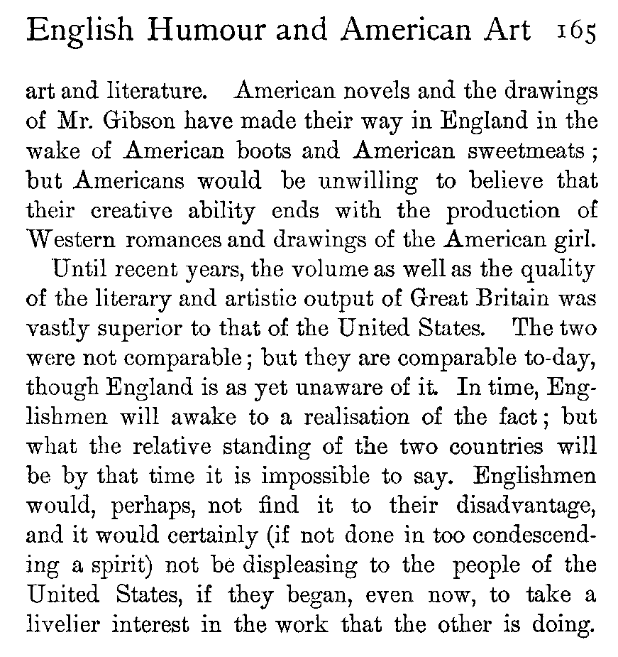 It is in the presence of such a remark, seriously made by so excellently capable a foreigner, that the Englishman and American ought to be able to shake hands and realise how much of a kin they are and how far removed from some other peoples.