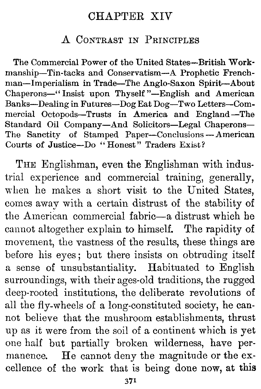 The Commercial Power of the United States—British Workmanship—Tin-tacks and Conservatism—A Prophetic Frenchman—Imperialism in Trade—The Anglo-Saxon Spirit—About Chaperons—"Insist upon Thyself"—English and American Banks—Dealing in Futures—Dog Eat Dog—Two Letters—Commercial Octopods—Trusts in America and England—The Standard Oil Company—And Solicitors—Legal Chaperons—The Sanctity of Stamped Paper—Conclusions—Do "Honest" Traders Exist? |