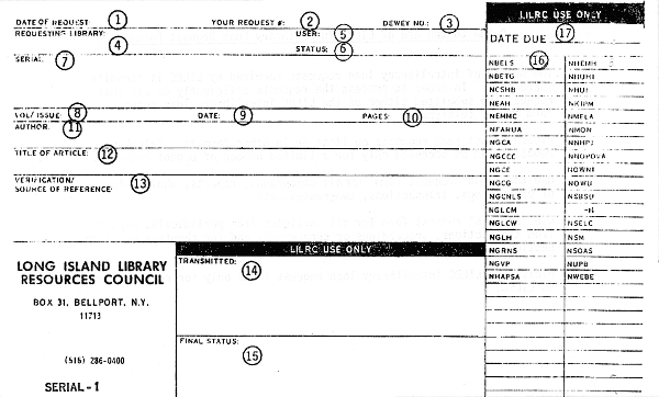 Requests may be submitted on LILRC interlibrary loan forms which we supply, and sent in by mail or by our driver. They may be placed by teletype, using a format based on the LILRC request form. Urgent requests may be placed by telephone.
