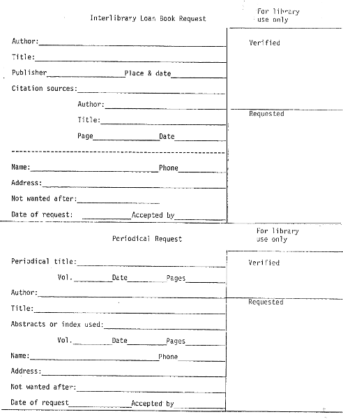 Borrowing libraries may find it helpful to develop worksheets (see samples in Appendix B) to be used by the reader and the librarian in preparing the interlibrary loan request, indicating all the items we need to know.