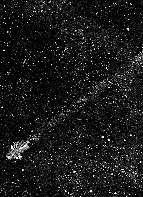 When I finally did get the thing on, I went out the air lock. If the leak had been bad enough, I would have been able to see the air spurting out through the hole, a miniature geyser. But I found no more than what I expected. I crawled around the entire circumference of the hull and found only a thin silvery haze. The air as it leaked out formed a thin atmosphere around the hull, held there by the faint gravity of the ship's mass. Dust motes in the air, reflecting sunlight, were enough to hide any microscopic geyser spout. Before I re-entered the air lock I looked out into space, in the direction away from the sun. Out there, trailing far away, the air had formed a silver tail, I saw it faintly shimmering in the night. I was going to make a good comet.