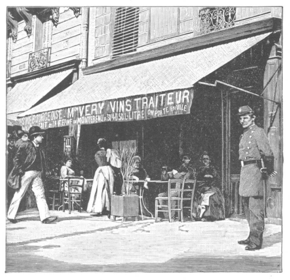 There has been no successful street revolution in Paris since the days of the Commune, but the terrible under-strata ever and anon break through the thin upper crust of society with some such outburst as that of the dynamite explosions of 1892 in the Boulevard Saint-Germain, in the caserne Lobau, and in the Rue de Clichy. On this occasion, the Paris Matin published the result of the official researches as to the locality of the various groups of anarchists in the city, from which it appeared that they were to be found in associations of greater or lesser numbers in the quartiers of the Bourse, of the Temple, of the Panthéon, of the fashionable Champs-Élysées, among the valets de chambre, the cooks, and the coachmen, and in the fourth, ninth, tenth, eleventh, twelfth, thirteenth, fifteenth, eighteenth, and nineteenth arrondissements. In the quartiers of the Louvre, of the Luxembourg, and in the seventh, sixteenth, and seventeenth arrondissements, no organized groups existed. Their titles varied: L'Avant-garde cosmopolite, Le Réveil du quinzième (arrondissement), La Bibliothèque socialiste, La Jeunesse anarchiste du vingtième (arrondissement), La Jeunesse révolutionnaire and La Ligue des antipatriotes; their publications ranged from Le drapeau rouge [the red flag] to La Révolte and Henri Rocheforte's Intransigeant. The arrest of the chief dynamiter, Ravachol, was effected through the intelligence of a waiter named Lhérot in the restaurant Véry, on the Boulevard Magenta, of which we give a view, on Victor Hugo's authority that it is always interesting to look at a wall behind which we think something is happening.
