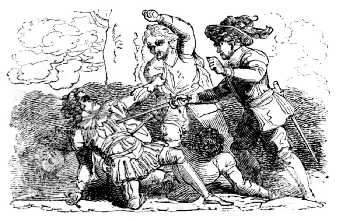 "Don Alonzo, a Spanish nobleman, had a beautiful and virtuous wife, with whom he had lived some years in great tranquillity. The gentleman, however, was not free from the faults usually imputed to his nation; he was proud, suspicious, and impetuous. He kept a Moor in his house, whom, on a complaint from his lady, he had punished for a small offence with the utmost severity. The slave vowed revenge, and communicated his resolution to one of the lady's women, with whom he had lived in a criminal way. This creature also hated her mistress, for she feared she was observed by her; she therefore undertook to make Don Alonzo jealous, by insinuating that the gardner was often admitted to his lady in private, and promising to make him an eye witness of it. At a proper time, agreed on between her and the Morisco, she sent a message to the gardner, that his lady, having some hasty orders to give him, would have him come that moment to her in her chamber. In the mean time she had placed Alonzo privately in an outer room, that he might observe who passed that way. It was not long before he saw the gardner appear. Alonzo had not patience, but following him into the apartment, struck him at one blow with a dagger to the heart; then dragging his lady by the hair, without inquiring farther, he instantly killed her.