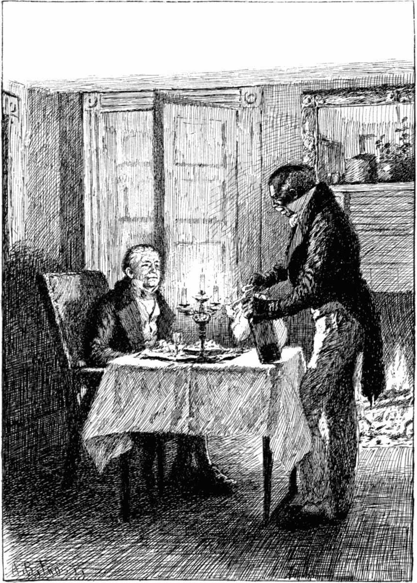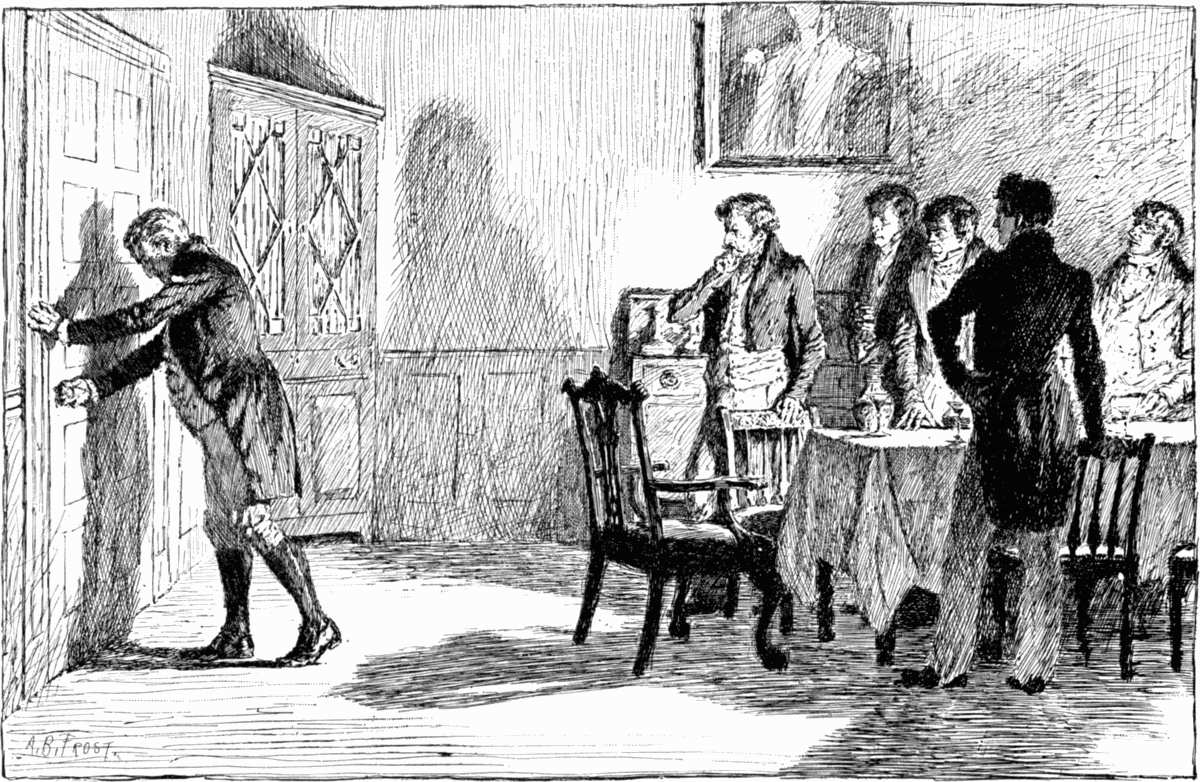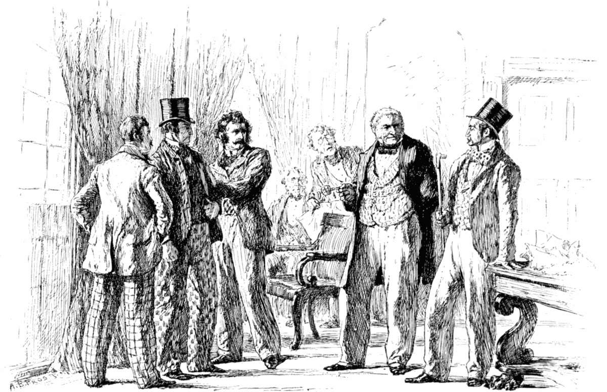 When the white-haired old lady who sat in this coach, with a very little girl by her side, saw Mr. Dolph and his son, she leaned out of the window and signalled to the old periwigged driver to stop, and he drew up close to the sidewalk. And then Mr. Dolph and his son came up to the window and took off their hats, and made a great low bow and a small low bow to the old lady and the little girl.[12]