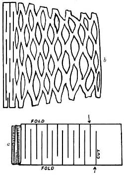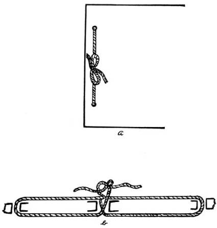 Fasten the legs and arms to the body with a string tied loosely to allow free movements. Make a frame[Pg 110] of two light stiff sticks and a crosspiece fastened between them near the lower end of the sticks. Fasten with a single nail at either end of the crosspiece. Cut notches near the upper ends of the sticks. Fasten the figure to the frame by a stout thread. Use a coarse needle and carry the thread through the hands twice, leaving a loop on each side to slip over the ends of the sticks into the notches. A small block or folded bit of cardboard between the hands to keep them apart will improve the movement of the toy. Adjust the figure so that the threads are parallel when the figure hangs below the inverted frame. (See Fig. 61.) When the frame is held upright, the figure will hang between the sticks and the threads will be crossed. Press the lower ends of the frame together to make the jumping jack perform.