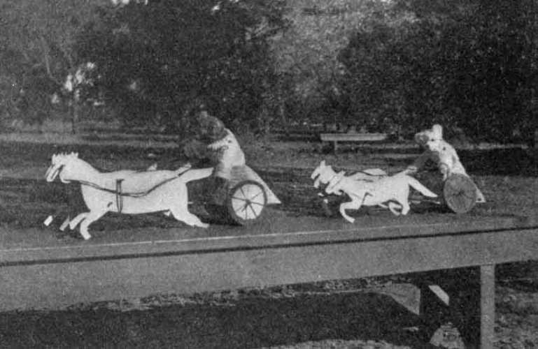 Merry-go-round.—Use a heavy block for a base. Bore a hole in the center and insert a square stick, about 10 in. long. For arms, use two pieces about ⅜ in. thick and 10 in. long. Fasten these together in the form of a cross and nail to the top of the upright with a single nail. An awl may be used to make the hole a little larger than the nail so that the arms will revolve easily. Suspend a box seat of wood or cardboard from each arm to complete the toy. (See Fig. 59.)