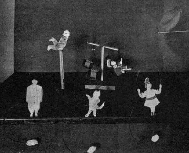Detail.—Cut the figures from cardboard. Make with a long pedestal. Color with crayon or water color. Use two light sticks for the seesaw, to which tack one figure in a vertical position and the other on a slant. Fasten to each stick with one tack. If a central figure is used, tack firmly to lower stick. Work the figure by moving the upper stick while the lower one is held firm.