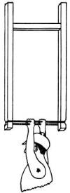 [Pg 109]Doll's Swing.—A heavy block for a base, two tall uprights, and a crosspiece will make the frame. Make a seat from cardboard or use the end of a small box and suspend from crossbar.