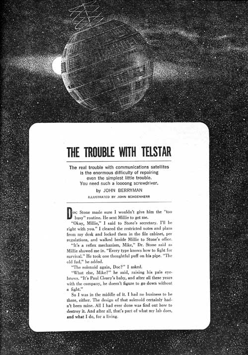 But I had. The last series of tests in my lab had put me in the middle of a hell of a scrap. It had all started a couple years back, when the final design had been approved for a whole sky-full of communications satellites. Well, eighteen, to be exact. One of the parts in the design had been a solenoid, part No. M1537, which handled a switching operation too potent for a solid-state switch. That solenoid was one of the few moving parts in the Telstars, and it had been designed for skeighty-eight million cycles before it got sloppy or quit.