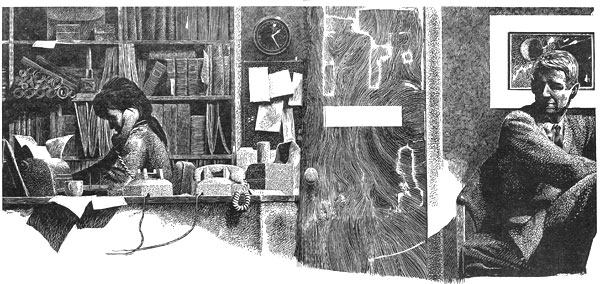 Paul Cleary had his coat off and was poring over a large black-on-white schematic when I was shown in by sniffin' Sylvia. "Hello, Mike," he growled. "Here, Sylvia. Mike's not supposed to see this stuff. Drag it away, honey. Drag it away!"