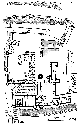 Le palais des rois, à Paris, dans lequel ces souverains tinrent leur cour depuis les Capétiens jusqu'à Charles V, présentait ainsi, au commencement du XIVe siècle, une réunion de bâtiments dont les plus anciens remontaient à l'époque de saint Louis, et les derniers dataient du règne de Philippe le Bel. Des fouilles récemment faites dans l'enceinte du palais de Paris ont mis au jour quelques restes de constructions gallo-romaines, notamment du côte de la rue de la Barillerie; mais dans l'ensemble des bâtiments il ne reste rien d'apparent qui soit antérieur au règne de Louis IX. Depuis Charles V, le palais fut exclusivement affecté au service de la justice, et les rois ne l'habitèrent plus. Ce souverain y fit faire quelques travaux intérieurs, ainsi que Louis XI; mais Louis XII l'augmenta en construisant le bâtiment destiné à la chambre des comptes, et qui se trouvait occuper, place de la Sainte-Chapelle, l'emplacement affecté aujourd'hui à l'hôtel du préfet de police. Nous donnons (fig. 2) le plan du palais de Paris à rez-de-chaussée, tel qu'il existait au commencement du XVIe siècle.