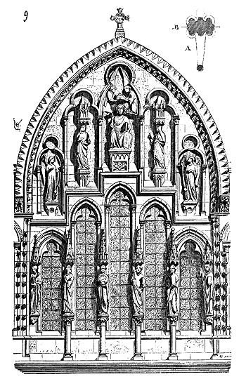 Ailleurs 371 nous avons expliqué comment les proportions des cathédrales de Paris et d'Amiens avaient été établies à l'aide des triangles égyptien et équilatéral. En effet, le triangle isocèle rectangle est rarement admis comme principe de proportions dans les édifices de la période gothique; le triangle dont la base contient quatre parties, et la verticale élevée du milieu de cette base au sommet, deux parties et demie (triangle égyptien), et le triangle équilatéral, deviennent dorénavant les générateurs des proportions.