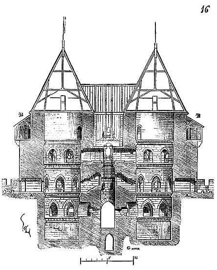 La coupe transversale du donjon, faite sur la ligne BG du plan (fig. 6), montre les deux salles inférieures, avec leurs voûtes reposant sur une épine de trois piliers, puis le second étage ne formant plus qu'une grand'salle sans piliers. Au-dessus se trouvent le galetas et les chemins de ronde desservant les mâchicoulis. Un escalier à vis compris dans une tour carrée, autrefois englobée dans les logis bâtis entre ce donjon et la grand'salle, permet d'arriver aux trois étages par un couloir détourné, ainsi que l'indique le plan.