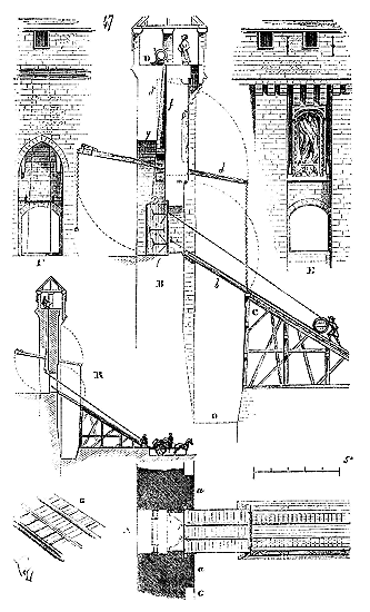 Ce puits, dont le plan est tracé en A, est pris dans un contre-fort saillant à l'extérieur du bâtiment. La manoeuvre du montage des seaux se faisait seulement à l'étage B (voy. la coupe C) au moyen d'un treuil à rouet. On voit encore en a, a', les trous carrés faits dans la pierre, ou plutôt ménagés dans une hauteur d'assise, qui servaient à passer l'arbre du treuil roulant dans le milieu d'une pièce de bois bien équarrie et de 25 centimètres de côté. La corde du puits faisant un ou deux tours sur le tambour b de ce treuil (voy. le plan A' et la coupe D), les seaux étaient suspendus à deux poulies obliques e fixées à la partie supérieure, en g; de sorte qu'en appuyant sur le rouet, soit dans un sens, soit dans l'autre, on faisait monter les seaux au niveau de l'un des étages, où ils étaient arrêtés par la personne chargée de recueillir leur contenu. Ce mécanisme fort simple est indiqué par le plan A' et par la coupe D 381.