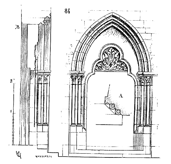 Si les puits placés extérieurement sur la voie publique étaient d'une grande simplicité, ceux qui s'ouvraient dans les églises où les cloîtres étaient souvent très-richement ornés. Leurs margelles, les supports des poulies, devenaient un motif de décoration. Il existait autrefois, dans le bas côté sud de la cathédrale de Strasbourg, un puits très-riche, taillé dans de la pierre de grès. Sa margelle était tracée sur plan hexagonal. Sur trois des faces, s'élevaient trois piles qui supportaient trois linteaux se réunissant au centre de l'hexagone (voy. le plan A, fig. 4), et soutenant, à leur point de jonction, la poulie attachée à un cul-de-lampe. Les trois linteaux étaient ornés d'arcs avec roses et redents. Une corniche couronnait ces linteaux (voy. l'élévation B).