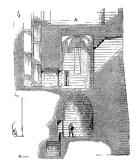 À chacune de ces poutres était suspendue une poulie. Ainsi, trois personnes en même temps pouvaient puiser de l'eau. En A, est tracé le plan de ce puits; en B, son élévation 379.