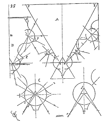 Voici comment a procédé l'architecte de la nef de Notre-Dame d'Amiens pour le tracé des tailloirs et des bases des colonnettes de la galerie (fig. 27). L'angle visuel le plus fermé, perpendiculaire à la nef, permettant d'apercevoir les tailloirs, est de 60º. Le profil a été tracé suivant la méthode indiquée en A, méthode qui n'a pas besoin d'être décrite après les démonstrations précédentes.