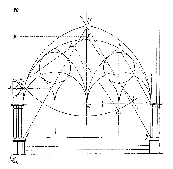 La figure 8 donne une portion du choeur de la cathédrale de Beauvais, l'axe étant en A. D'abord les axes des piles principales qui portent la haute nef ont été fixés à 14m,95 d'écartement (46 pieds.) Sur un point a pris sur l'un de ces axes, il a été élevé une ligne ab à 60º, laquelle a donné, par sa rencontre avec l'autre axe, le point b, centre d'une pile comme le point a. Tirant du point b une perpendiculaire aux axes, on a obtenu le point de rencontre c, centre d'une troisième pile. Ainsi ont été posés les centres des piles. Procédant toujours de même et prolongeant les lignes à 60º, on a obtenu une suite de triangles équilatéraux qui ont donné à leurs sommets les axes C des piles intermédiaires du double collatéral et le nu extérieur D du mur du bas côté. Les diamètres des noyaux cylindriques des piles de la haute nef ont été fixés à 4 pieds, ceux des piliers intermédiaires à 40 pouces; l'épaisseur du mur D; à 4 pieds. Ainsi ont été établis les axes, les écartements des piles, les largeurs des collatéraux. Jusqu'à présent le géomètre seul est intervenu. Il a toutefois la confiance d'avoir, grâce à sa méthode, établi sur plan horizontal des rapports harmonieux. En effet, une des conditions d'harmonie, en fait d'architecture, c'est d'éviter, en apparence directe, les divisions égales, mais cependant de faire que des rapports s'établissent entre elles. Par le moyen de ce tracé, les écartements entre trois des piles du choeur sont égaux, mais ces écartements sont plus de la moitié de l'ouverture de la nef. Les axes des piles a et c sont éloignés de plus de la moitié de l'entre-axe direct cb, tandis que les axes de ces piles a et c sont écartés de la moitié de la diagonale ab. Il y a donc rapport et dissemblance. De même les axes des piles a et d sont moins espacés que les axes a et c, mais ont entre eux une distance égale à la moitié de l'entre-axe ae. L'écartement df est plus petit que l'écartement ad. De sorte que si, dans le sens longitudinal, les travées sont pareilles, dans le sens transversal elles sont dissemblables, diminuant vers les extrémités. Cela était en outre conforme aux règles de la stabilité, car il était important de réduire successivement les poussées en approchant du vide.