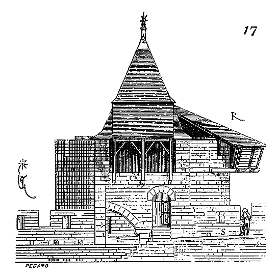 Le porche A était à claire-voie dans la partie inférieure, et vitré dans la partie supérieure. Cette disposition, adoptée fréquemment pour les cloîtres, produisait ici un effet très-pittoresque, ainsi que le remarque Sauval. Une coupe longitudinale (fig. 2) fera saisir la disposition originale de ces constructions ajoutées à la rotonde primitive.