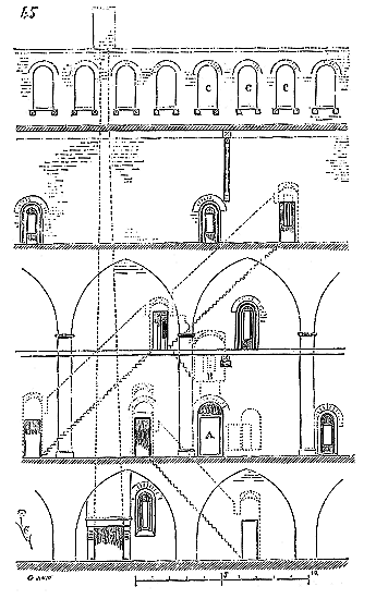 Or, ce genre de voûtes est un pas en arrière, non un progrès. Les berceaux ont une poussée continue et non répartie sur des points isolés; ils sont très-lourds, s'ils sont de pierre; leur effet n'est pas heureux, et les pénétrations des baies dans leurs reins produisent des courbes très-désagréables, que les Romains, avec juste raison, évitaient autant que faire se pouvait.