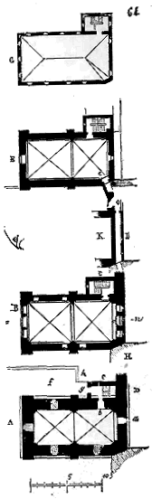 Réunissant les renseignements que nous avons pu nous procurer sur le Temple de Paris 9, nous donnons le plan de l'église (fig. 1). La rotonde datait de la première moitié du XIIe siècle. Après la sortie des templiers de la Palestine, cette rotonde fut augmentée au porche A, dont parle Sauval, et un peu plus tard de la grande nef B. Le bas du clocher C datait également du XIIe siècle, et l'étage du beffroi du commencement du XIIIe siècle.