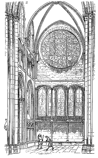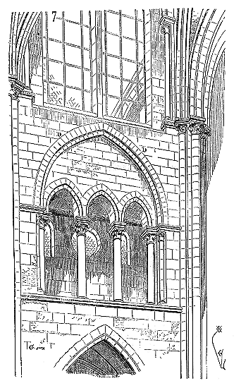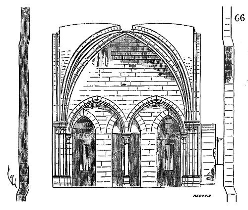Note 402: (retour) C'est grâce à l'obligeance de M. Lance, architecte diocésain de Sens, et aux sondages intelligents faits par son inspecteur, M. Lefort, que nous avons pu relever exactement cette arcature, qui présente une disposition si curieuse. Dans notre restitution, la forme des fenêtres est seule douteuse, bien que les pieds-droits de ces fenêtres soient encore accusés à l'extérieur et coïncident avec les pieds-droits de l'arcature du triforium. (Voyez TRIFORIUM.)