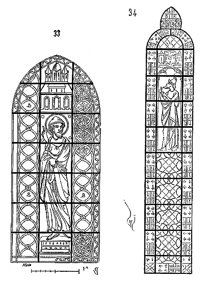 La figure 25 donne cette arcature à l'extérieur; les traces encore en place et de nombreux fragments permettent de la restituer sans difficultés 402. En perçant les nouvelles fenêtres, les architectes du XIIIe siècle se sont contentés de boucher les baies donnant autrefois sous le comble, et d'entailler les pieds-droits et archivoltes plein cintre suivant la courbe de l'archivolte de ces nouvelles baies. On voit encore en place, sur quelques points, les chapiteaux C, des portions d'archivoltes et toute la partie supérieure B. En A, sont les arrivées des arcs-boutants qui datent de la construction primitive. Cette arcature supérieure donnant au-dessus des voûtes se retrouve dans beaucoup d'églises romanes des provinces rhénanes, et avait pénétré jusque dans les parties orientales de la Champagne. Sa présence à Sens n'en est pas moins un fait assez remarquable.