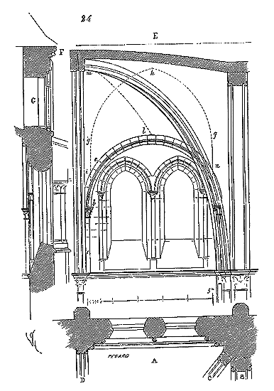 Note 406: (retour) Ce travail, inséré dans le premier volume des Transactions de l'Institut des architectes britanniques, a été traduit, en 1843, par M. Daly, dans la Revue d'architecture (t. IV). Le traducteur, dans l'introduction qui précède le texte de M. Willis, ne fait pas ressortir les différences profondes qui séparent la structure des voûtes anglaises de celle des voûtes françaises, et ne semble pas avoir étudié ces dernières; mais en 1843 personne n'était en état de se livrer à un travail critique sur cet objet.
