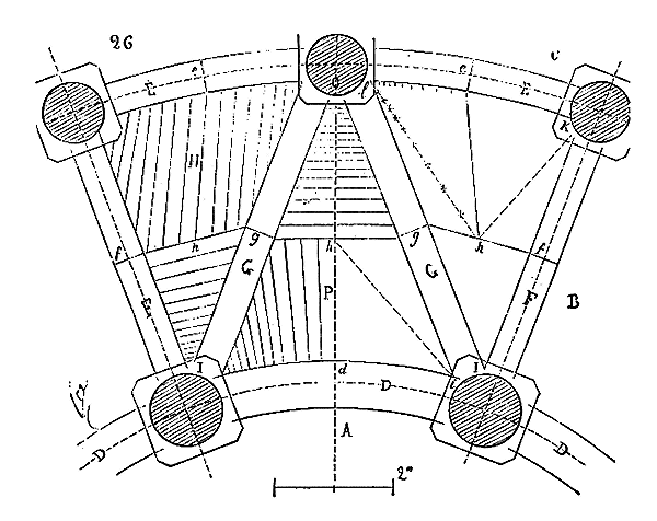 Tout ceci n'est que de la géométrie descriptive très-élémentaire, et ne demande pas de grands efforts d'intelligence de la part du traceur, mais les conséquences au point de vue de la structure sont importantes. D'abord, puisque nous n'avons qu'une seule courbe composée pour tous les arcs; ou plutôt, que tous les arcs ne sont qu'un segment plus ou moins étendu d'une même courbe composée, les panneaux d'appareil d'un arc peuvent servir pour tous les arcs; de plus, les arcs, en pivotant autour de la verticale élevée dans l'axe de la pile g, devant nécessairement passer par un même plan courbe, puisqu'ils ont tous la même courbe, donnent à l'extrados une forme conoïde concave en manière de pavillon de trompette, qui simplifie singulièrement la pose des moellons de remplissage.