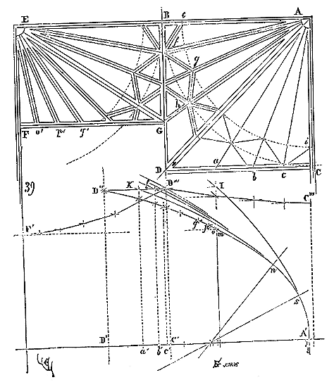 Voyons (figure 39) comment ce système de structure des voûtes anglaises incline vers une méthode de plus en plus mécanique. Soient en ABCD un quart de voûte carrée, et en EBFG un quart de voûte barlongue. Dans la première, l'arc ogive est l'arc AD; dans la seconde, l'arc ogive est l'arc EG. Ayant admis, comme le montre la figure 36, que les tiercerons doivent être multipliés, afin de ne plus considérer les remplissages que comme des panneaux, non plus comme des voûtains, il s'ensuit naturellement que ces panneaux doivent, autant que faire se peut, être semblables comme étendue. Pour tracer les tiercerons, ce ne sera donc plus les liernes que nous diviserons en parties égales, comme dans l'exemple 36, mais nous décrirons le quart de cercle BC pour le quart de la voûte carrée, et nous diviserons ce quart de cercle en parties égales. Par les points diviseurs faisant passer des lignes Aa, Ab, Ac, nous aurons la projection horizontale des tiercerons d'un huitième de la voûte. Dès lors les angles DAa (A sommet), aAb, bAc, cAC, seront égaux et les panneaux compris entre leurs côtés semblables. Nous étrésillonnerons ces tiercerons par des contre-liernes e, f, g, h, etc., comme dans l'exemple figure 36, mais ici tracées de telle sorte que leurs points de rencontre se trouvent sur les quarts de cercle BC, ei. Ou nous voulons adopter pour tous ces arcs une seule et même courbe composée, comme dans l'exemple fig. 35, ou nous voulons que les liernes BD, DC, soient de niveau. Dans le premier cas, nous prenons l'arc ogive AD comme étant le plus étendu, nous le rabattons sur la ligne A'D', nous élevons la perpendiculaire D'D" (D" étant la hauteur de la voûte sous clef), et nous traçons, au moyen de deux centres, la courbe composée A'D". Procédant comme il a été dit ci-dessus; prenant les longueurs Aa, Ab, Ac, AC, et les reportant sur la ligne A'D' en A'a', en A'b', en Ac', en A'C', et de ces points, a', b', c', C', élevant des perpendiculaires à la ligne A'D', ces perpendiculaires rencontreront la courbe A'D" en des points qui donneront les hauteurs sous clef de chacun des arcs Aa, Ab, etc., et par suite, pour la lierne DC, la projection verticale C'''D'''. Mais si nous prétendons poser ces liernes de niveau, alors il nous faudra chercher, au moyen du procédé indiqué figure 38, les courbes A'K, A'l, etc., en conservant toujours pour les sommiers la même courbe A'n.