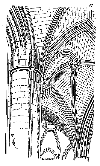C'est la dernière expression de la combinaison des naissances d'arcs de voûtes en France, et ce parti fut suivi jusqu'à l'époque de la renaissance. Ce sont là des conséquences rigoureuses du principe de la voûte trouvée au XIIe siècle; mais, quant au mode de structure, il ne varie pas, c'est-à-dire que les arcs remplissent toujours les fonctions de cintres permanents recevant des voûtains de remplissage entre leurs branches, voûtains qui ne deviennent jamais des panneaux, mais sont construits par petits claveaux dont les rangs courbés partent toujours de l'arc-doubleau, archivolte ou formeret, pour venir reposer à l'autre extrémité en biais, sur les arcs ogives.