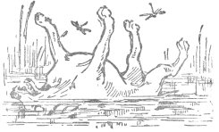 The river—with the sunlight flashing from its dancing wavelets, gilding gold the grey-green beech-trunks, glinting through the dark, cool wood paths, chasing shadows o’er the shallows, flinging diamonds from the mill-wheels, throwing kisses to the lilies, wantoning with the weirs’ white waters, silvering moss-grown walls and bridges, brightening every tiny townlet, making sweet each lane and meadow, lying tangled in the rushes, peeping, laughing, from each inlet, gleaming gay on many a far sail, making soft the air with glory—is a golden fairy stream.