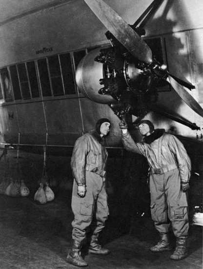 Figure 16.—Capt. Karl Fickes, acting head of Goodyear’s airship operations, pointing out features on one of the “Defender’s” Packard diesel engines to Roland J. Blair, Goodyear airship pilot, Akron, Ohio. From “Aero Digest,” February 1932. (Smithsonian photo A49674.)